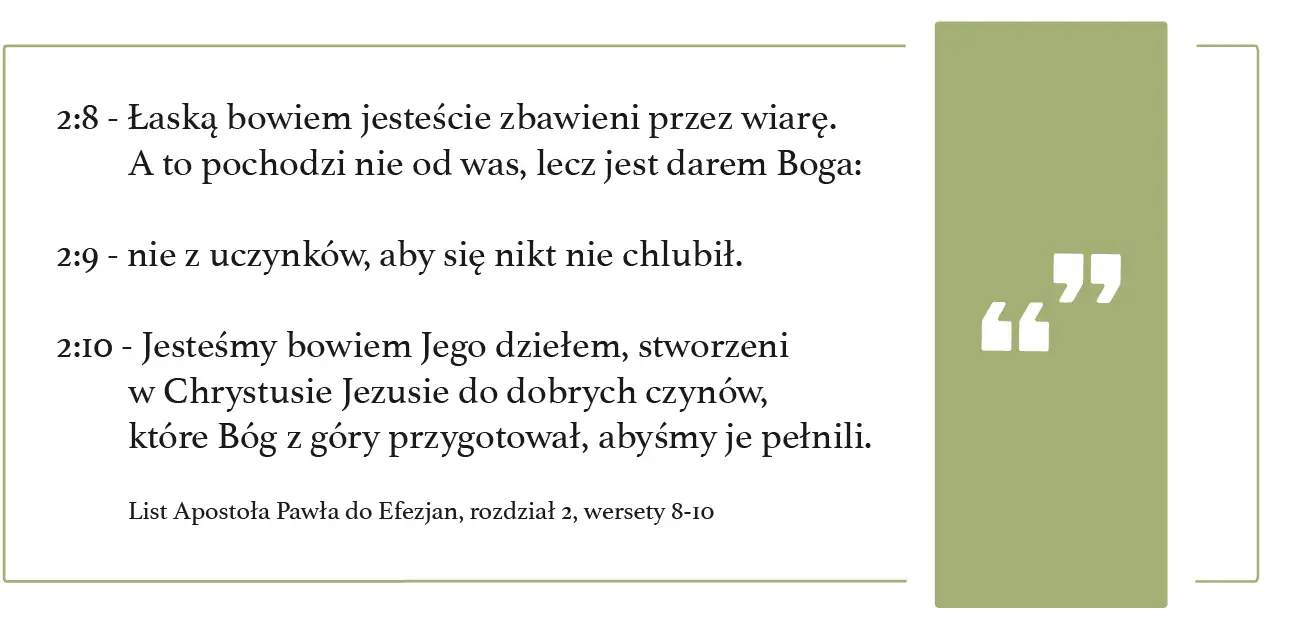 Jesteśmy zbawieni przez łaskę. Jest to dar od Boga, a nie zapłata za nasze zasługi. Jesteśmy stworzeni w Jezusie do dobrych uczynków.